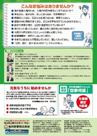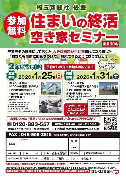 トップページ「空き家」が社会問題... お知らせ 2026年1月16日 「空き家」が社会問題となっている今、知っておくべき「住まいの終活」 「空き家」が社会問題となっている今、知っておくべき「住まいの終活」 「いつかは考えなければならないけれど、今はまだ大丈夫…」そんな空き家の放置が、大きな問題を引き起こす時代になっています 。 空き家になる前にできる対策や、法律の知識、コストのリスクまで、松井産業が分かりやすく解説します 。 事前予約なしでの当日参加も大歓迎です。ぜひお気軽にご来場ください!